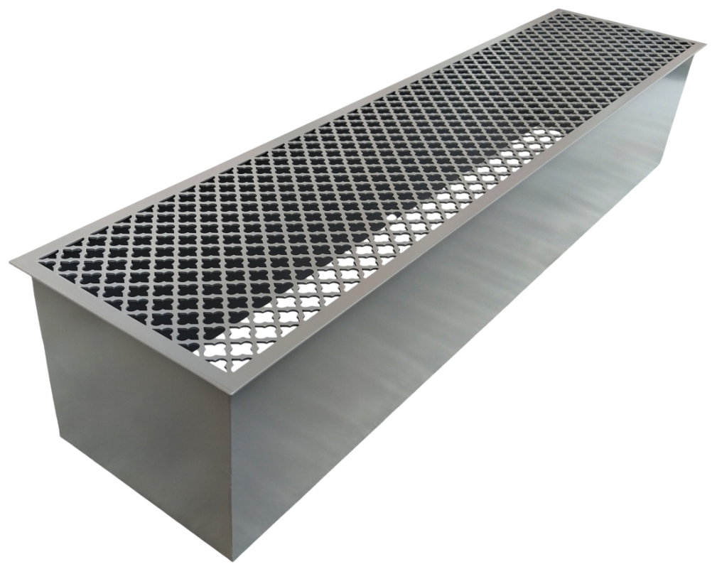 Вентиляционная решётка из нержавеющей стали - ЛР8 729×178. Технология изготовления - лазерная резка. Решётка окрашена порошковой краской в цвет RAL 9007 (металлик). С тыльной стороны решётки приварен патрубок увеличенной глубины 135 мм. Согласно запроса клиента. Чтобы патрубок прошёл весь «пирог» короба камина.