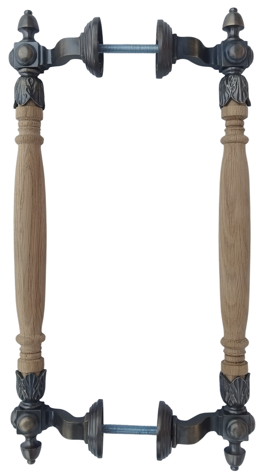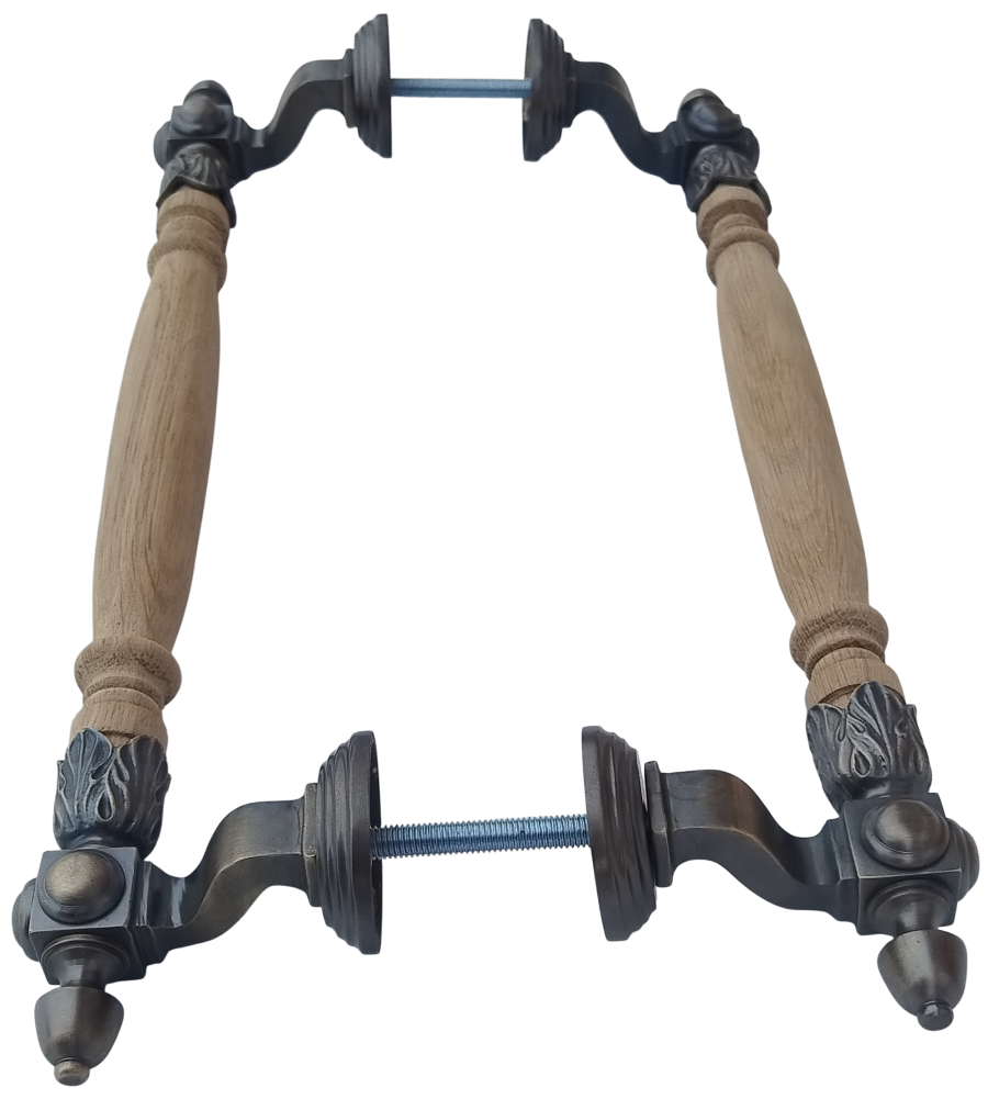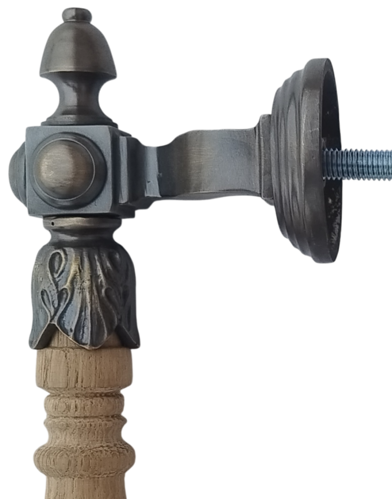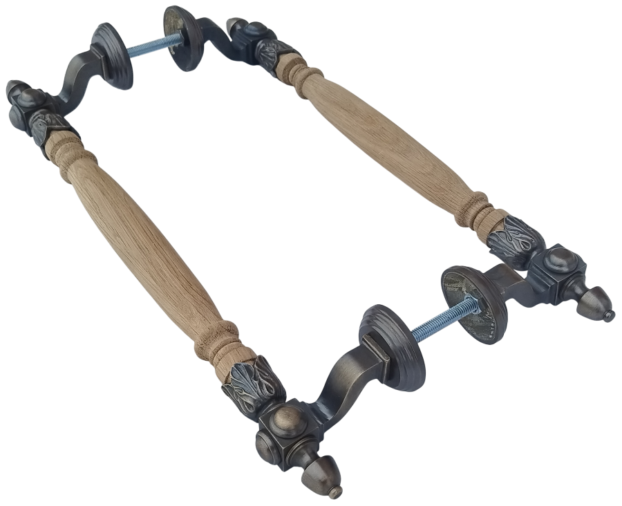 Красивая парадная ручка из латуни с деревянной державкой. Боковое подсоединение — кронштейны отведены в сторону