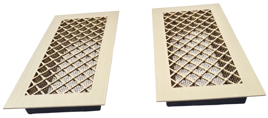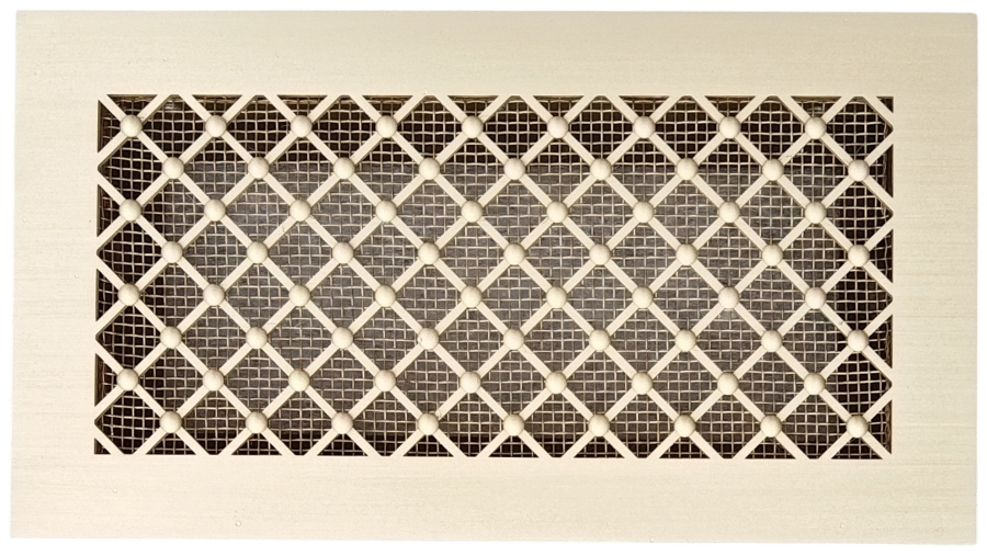 Эти вент. решётки изготавливаются под заказ, по индивидуальным размерам. Также можно можно изменить размеры и масштаб ячеек орнамента, учесть другие пожелания. Например, мелкая сетка с тыльной стороны решётки может быть стальная, окрашенная в чёрный цвет.