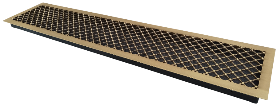 Вентиляционная решётка в стиле «Английский ампир» изготовлена из матовой латуни. Поверхность защищена 2-х компонентным лаком. Наружные размеры — 824*174 мм. Для установки в проём 800*150 мм. Добавлена мелкая стальная сетка чёрного цвета. С тыльной стороны решётки припаян патрубок. В комплекте прилагается монтажная рамка. В ней решётка фиксируется при помощи клипс.