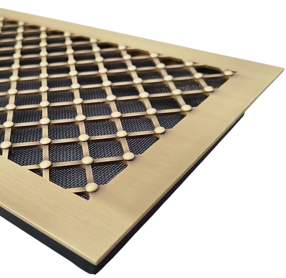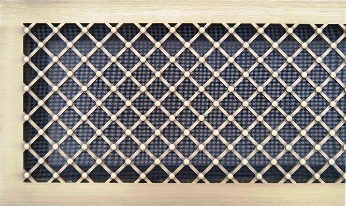 Эти вент. решётки изготавливаются под заказ, по индивидуальным размерам. Также можно можно изменить размеры и масштаб ячеек орнамента, учесть другие пожелания. Например, мелкая сетка с тыльной стороны решётки может быть латунная.