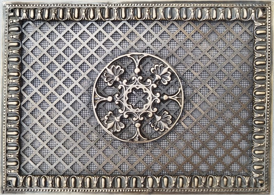 Основа решётки изготовлена по технологии лазерной резки металла. По периметру решётка декорирована литым багетом из латуни. Доступны различные варианты багета. Они отличаются по дизайну и по ширине.