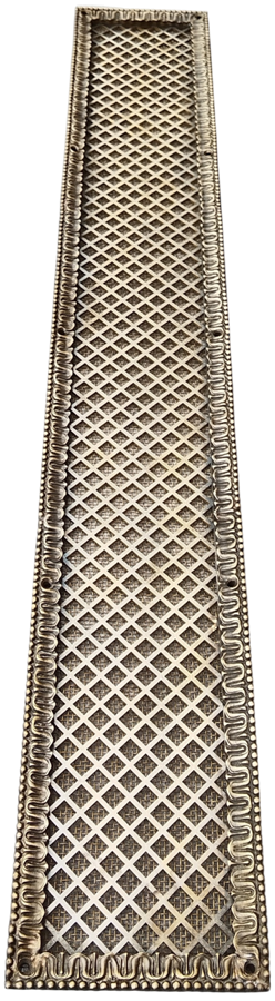 Длинная вентиляционная решётка из латуни, декорированная литым багетом из латуни. Патина «под бронзу».