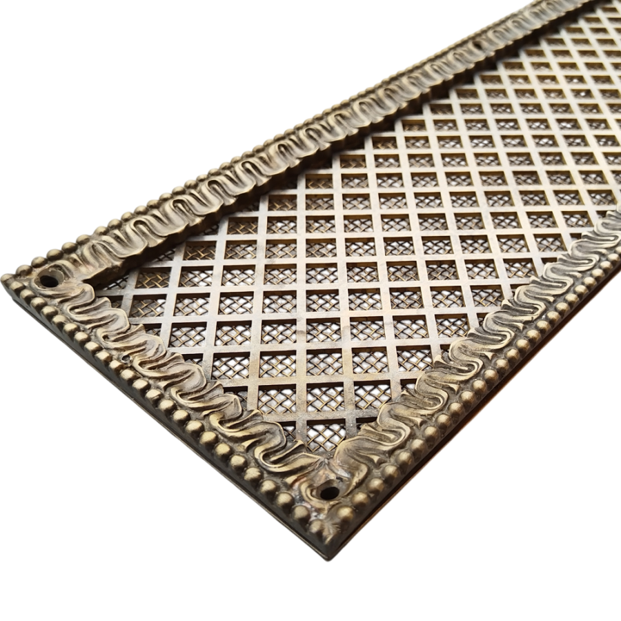 Основа решётки изготовлена по технологии лазерной резки металла. По периметру решётка декорирована литым багетом из латуни. Доступны различные варианты багета. Они отличаются по дизайну и по ширине.