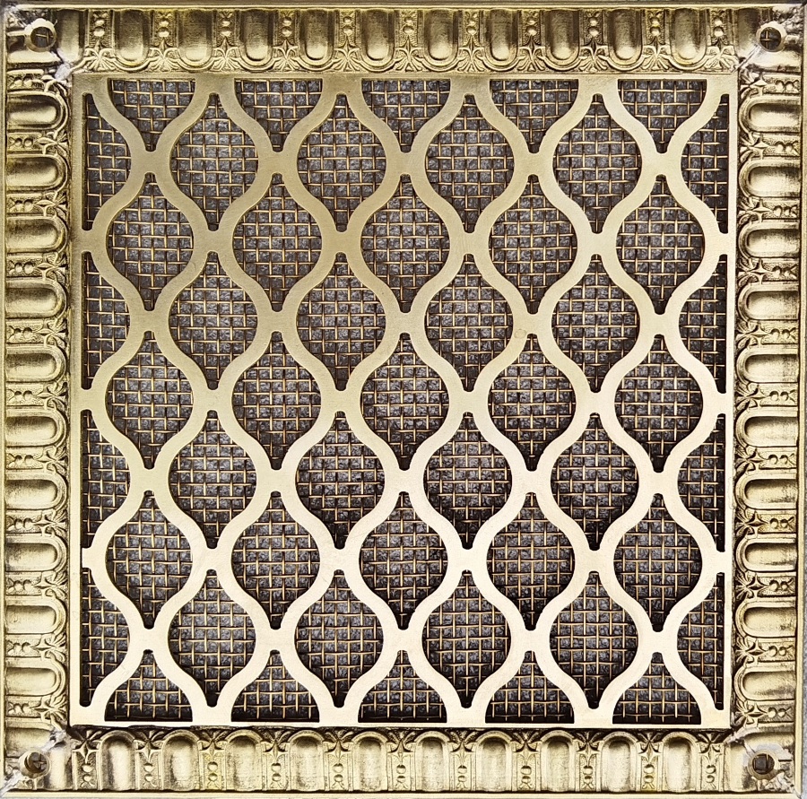 Основа решётки изготовлена по технологии лазерной резки металла. По периметру решётка декорирована литым багетом из латуни. Доступны различные варианты багета. Они отличаются по дизайну и по ширине.