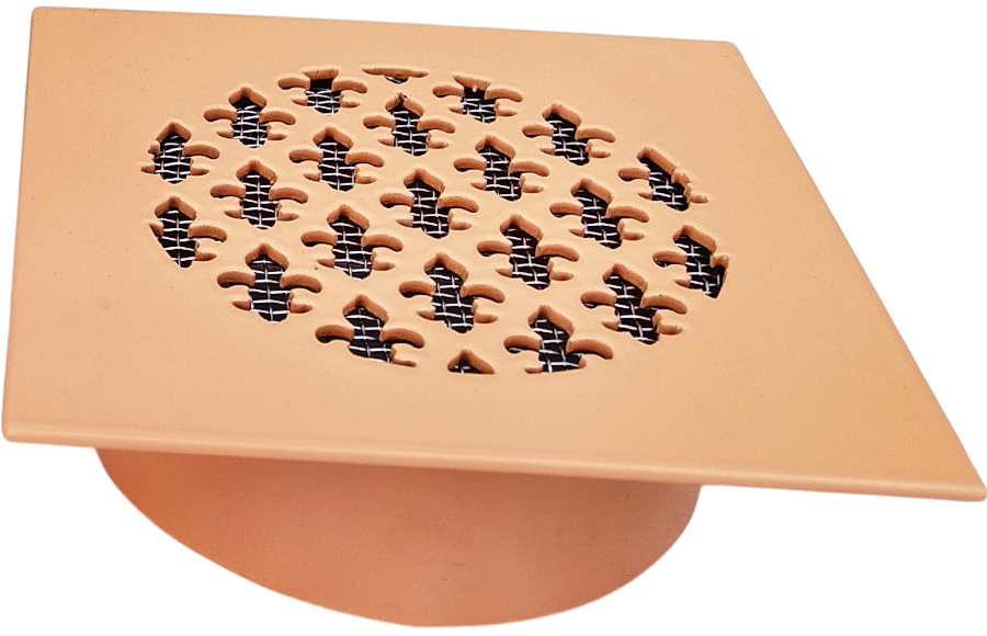 Вентиляционная решётка из стали - ЛР20 125×125. Технология изготовления - лазерная резка. Окрашена порошковой краской в цвет RAL 3012. С тыльной стороны решётки приварен патрубок диаметром 98 мм. Мелкая стальная сетка.