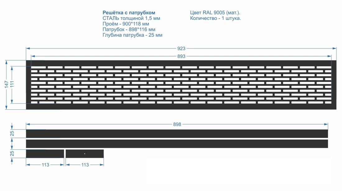 Вентиляционная решётка из стали - ЛР25 923×147. Технология изготовления - лазерная резка. Окрашена порошковой краской в цвет RAL 9005. С тыльной стороны решётки приварен патрубок.