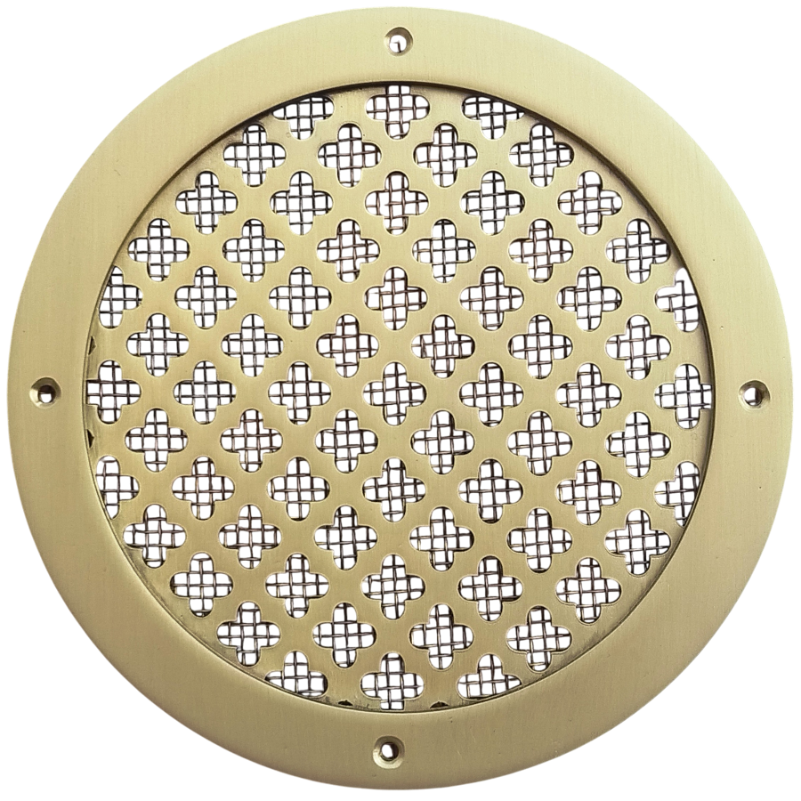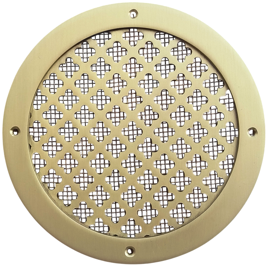 Накладная вентиляционная решётка - ЛР3 D150. Материал - латунь толщиной 2 мм. По внешнему контуру решётки припаяно латунное кольцо для придания решётке объёма. Технология изготовления - лазерная резка. 2-х компонентный защитный лак.