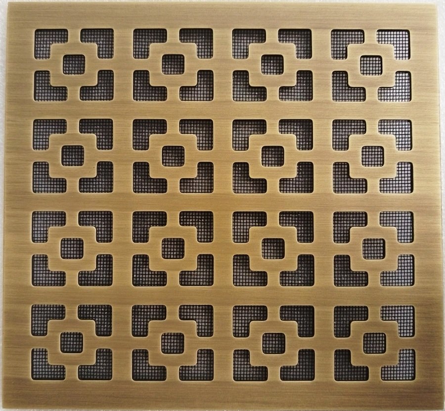 Поверхность латунных вент. решёток может быть матовая, полированная, патинированная «под бронзу». Возможна патина различных оттенков — от светлого к тёмному. Способы крепления такой вентиляционной решётки могут быть различные. Изготавливается на заказ по индивидуальным размерам.