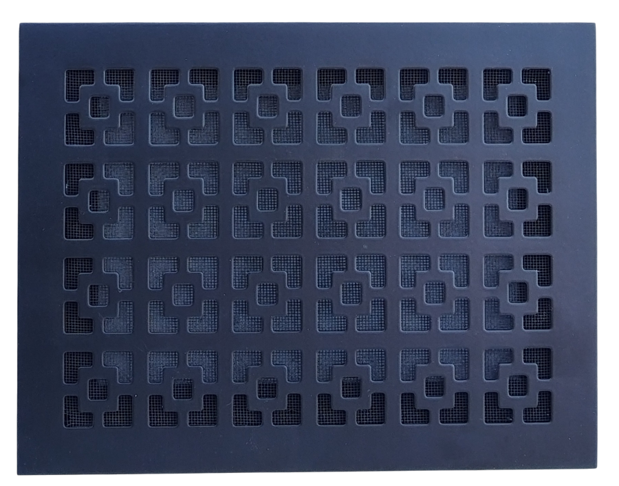 Вентиляционная решётка из стали - ЛР4 2217. Технология изготовления - лазерная резка. Окрашена порошковой краской в цвет RAL 9011. С тыльной стороны решётки приварен патрубок. В комплекте прилагается монтажная рамка с клипсами для надёжной фиксации решётки.