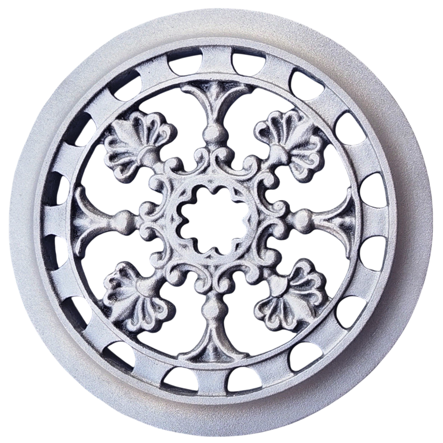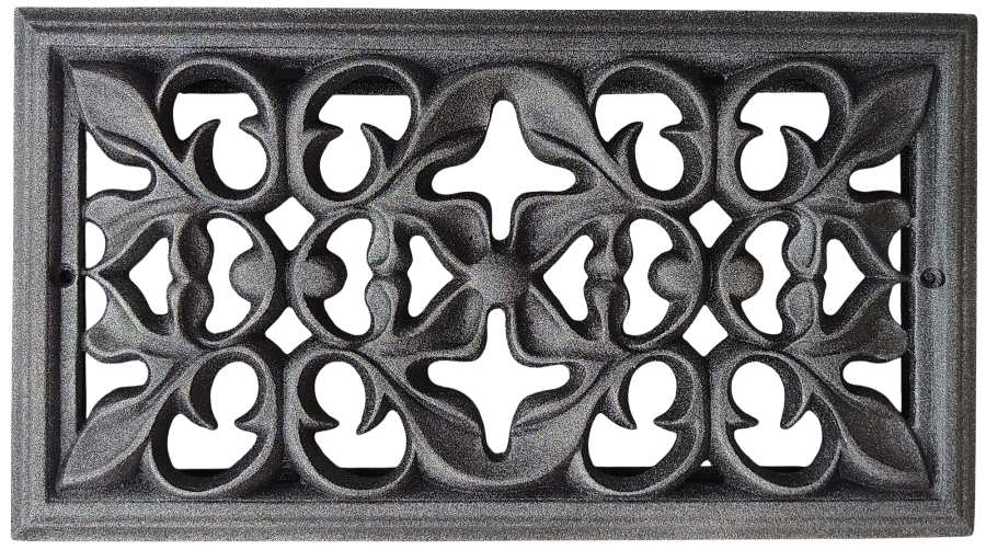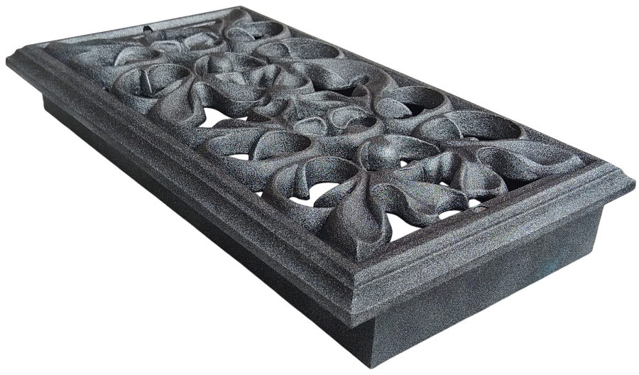 На фото — пример литой решётки К7 из чугуна. Она окрашена поршковой краской цвета «графит» с эффектом металлик.